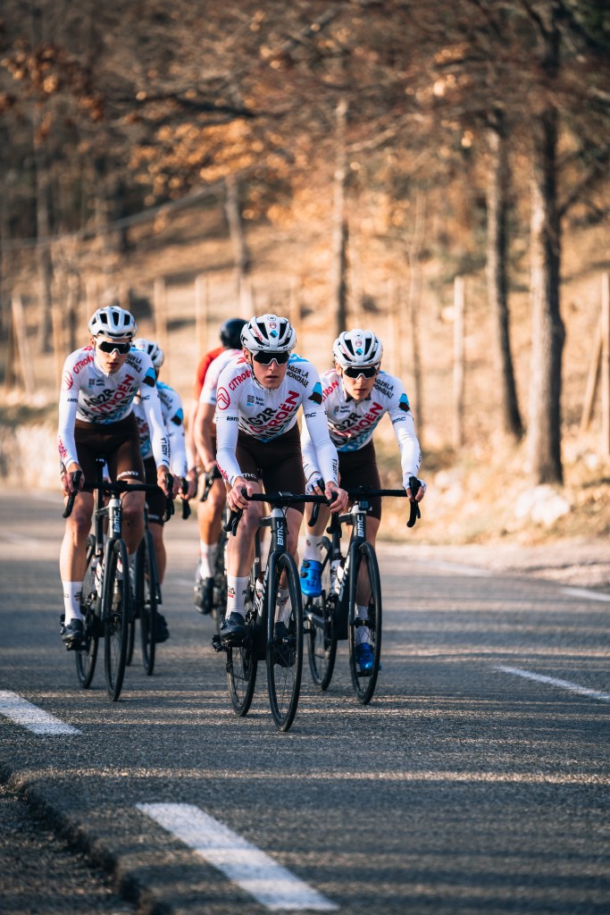 Our first camp, based in the small village of Trescléoux in the Hautes-Alpes department, featured 20 hours of training and focused on team time trial work. If you don’t know what that is, it’s six or seven riders in tight linear formation — just a few inches between back and front wheels at 30 mph or more — for the fastest whole-team time. One of the Coupe de France races this year is a team trial, so our AG2R Citroen U23 team seeks to perfect this exacting discipline. I’ve never raced a road team time trial before, but I’ve done plenty of team pursuit work on the track, so everything felt pretty natural after a few exchanges. I got a few uncompromising reminders, though, such as the fact that it’s nearly impossible to get back on the wheel (or on the train, if you can picture that) if you leave too much of a gap, especially at 60 km/h. Our second camp went smoothly, except when two-thirds of the team, including me, crashed on a descent. We hit a patch of ice coming out of a tunnel, on what were otherwise completely dry roads, and couldn’t avoid going down. Thankfully, there were no serious injuries, and we finished the ride, safe and sound other than some road rash and shredded clothing.