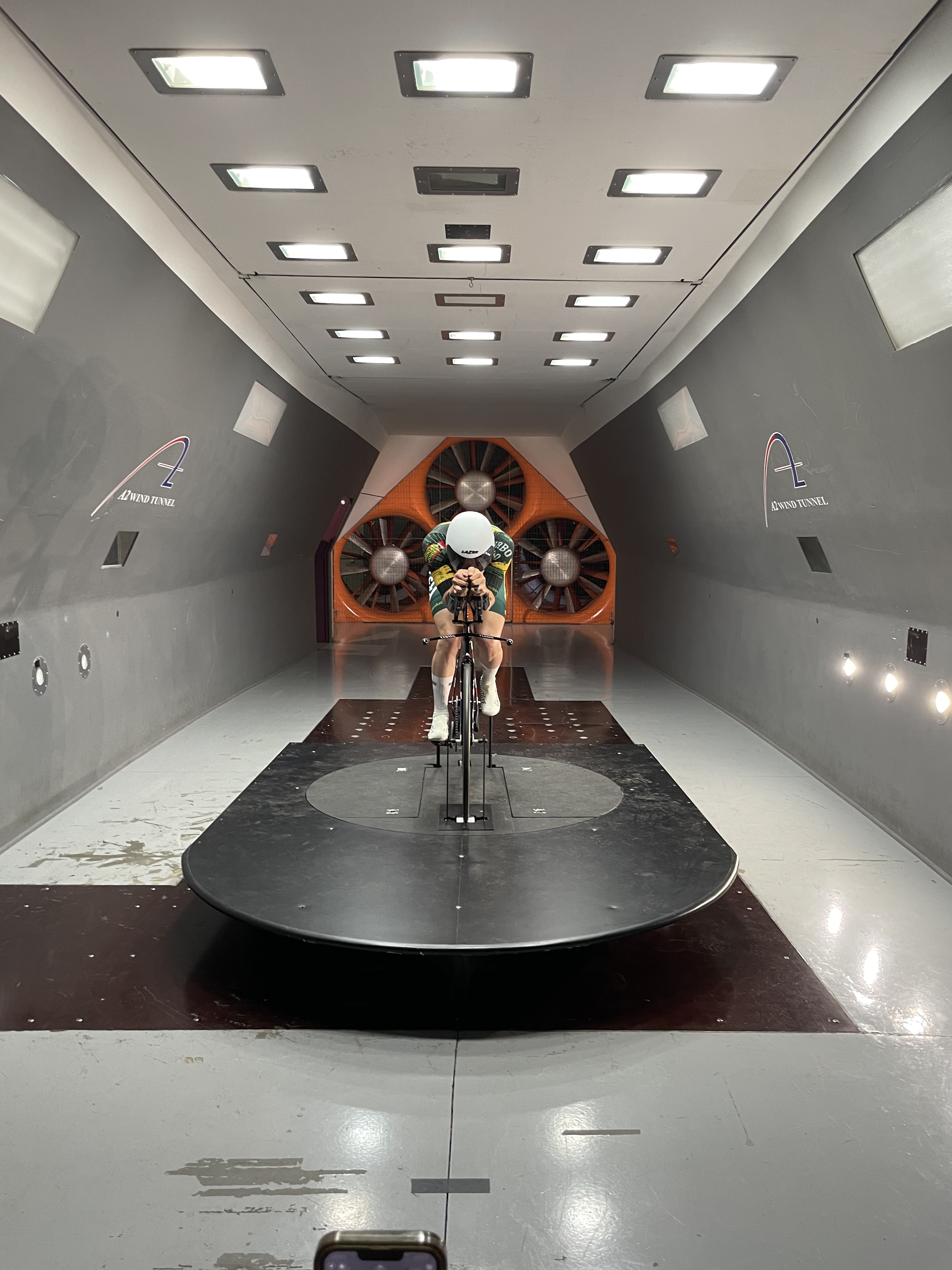 The trip ended with a whirlwind, as I headed to the A2 wind tunnel near Charlotte, North Carolina for a day of aerodynamic testing. In the constant pursuit for speed, cyclists deal with two main components: power applied to the pedals, and wind resistance. Wind resistance, which increases with the square of speed, thus becomes critical for track racing, where average speeds range from 50-65kmh (30-40mph). This means that the wind resistance I face at top speed on the track could be nearly seven times greater than one might experience on an easy road ride.