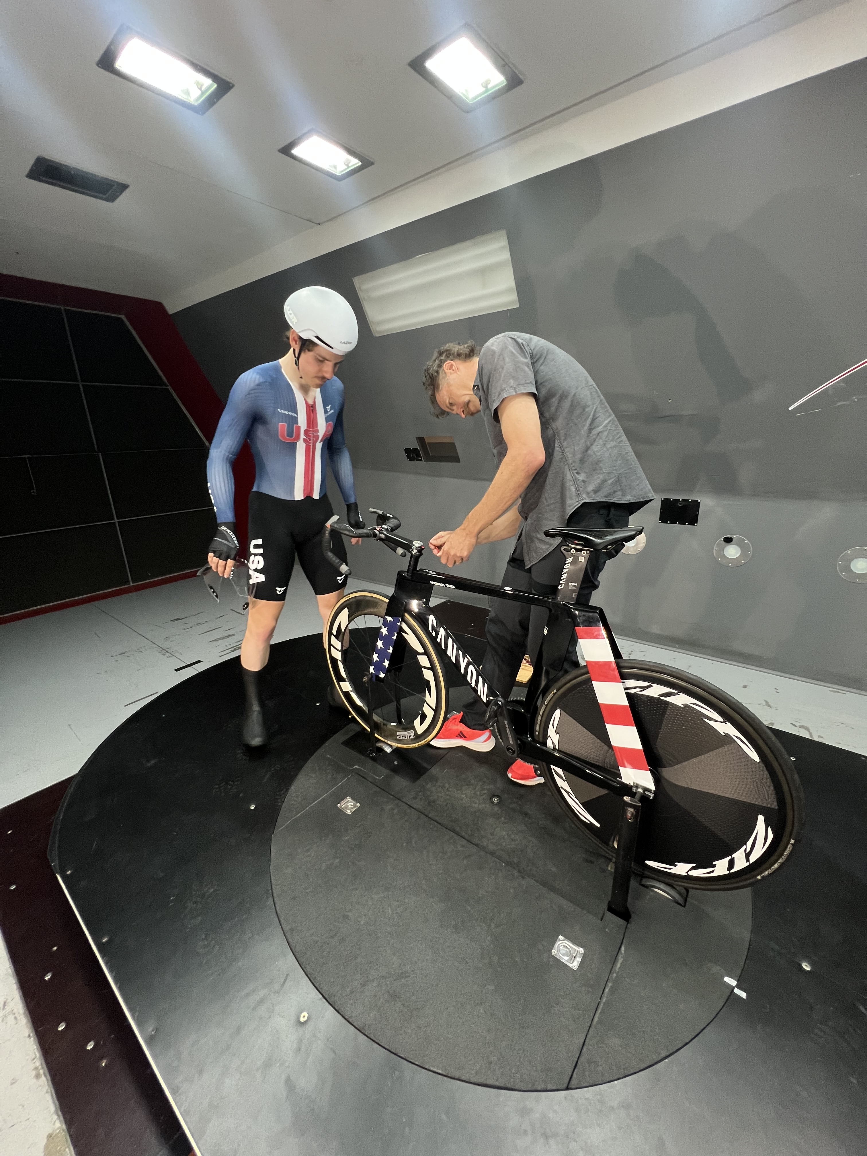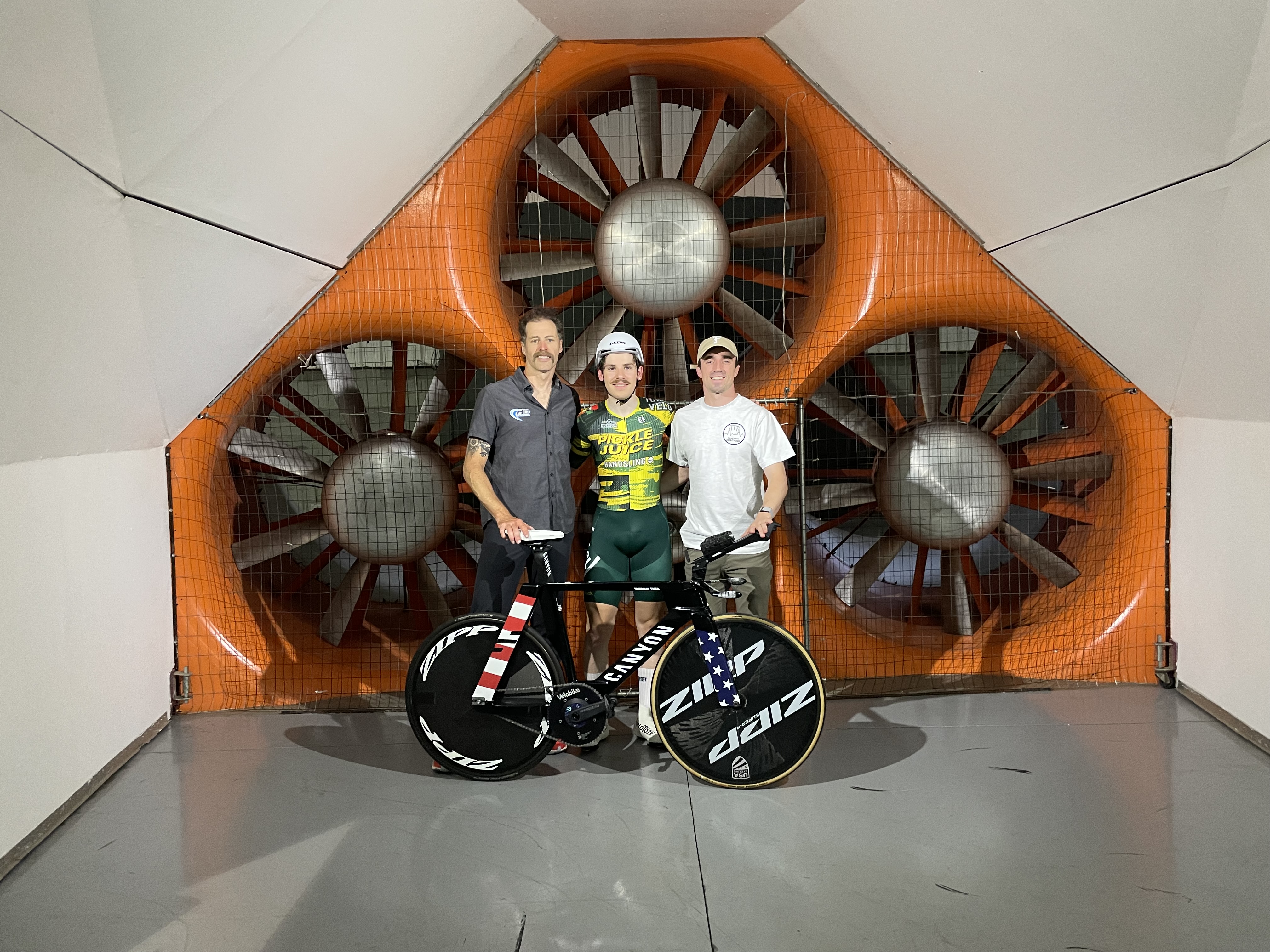 Unfortunately, aerodynamics are extremely unintuitive. For some riders, a higher position may be faster, while for others, a lower position can be faster. A myriad of different factors influence aerodynamics such as stack height, shoe selection, fabric tension over your body, fabric texture, equipment selection, body size, helmet shape, and many more, all of which interact with each other in different ways. My track team, TurboVelo Pickle Juice, gave me the opportunity to spend a day at the A2 Wind Tunnel seeking to lower my CdA, or coefficient of aerodynamic drag, and to find more comfortable or powerful positions with the same CdA. It’s difficult to explain what a wind tunnel looks like, so I’ll let the pictures do the talking. The fans are positioned at the rear of the tunnel so that the air is pulled over my body, allowing it to be “smooth.” In a rough explanation, bikes are positioned on a highly sensitive scale that measures how much the bike/rider system moves backwards when pushed by a given wind velocity. Together with aerodynamic advisor Heath Dotson, Tristan Manderfeld, and my Mom who both joined for the trip, we were able to complete 27 test runs over three hours. The process is highly detailed and surprisingly exhausting. By the end of the day, I hadn’t found many true gains in CdA, but rather found many ways to make my position more comfortable while keeping the same CdA. If you can’t maintain a position, it’s worthless in a race.